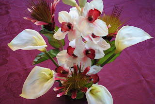 Upon returning home, the closest I could come to being reminded of my beloved subtropical holiday decor is by making a silk floral arrangement filled with some of my favorite reds, whites and greens that are indigenous to the tropics. So if you need a little warming up right now as I do, try making this simple but elegant centerpiece.